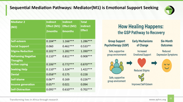 This lived experience from Hoima perfectly mirrors our quantitative findings: Our mediation analyses confirm that: Emotional social support is the earliest and strongest mechanism through which GSP reduces depression. Reduced stigma and enhanced self-worth are key pathways sustaining recovery over time.